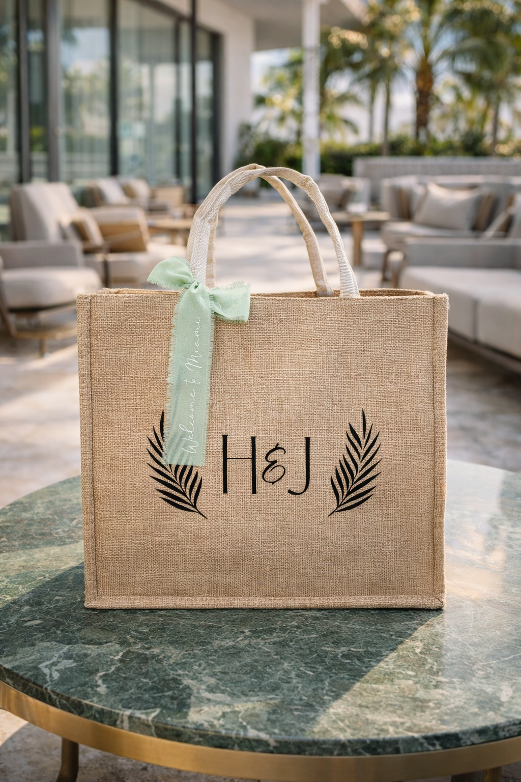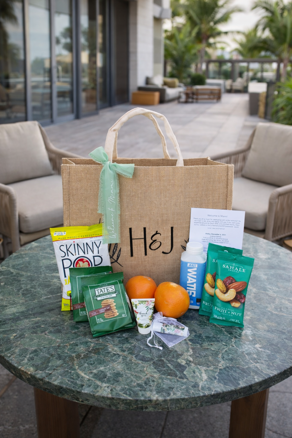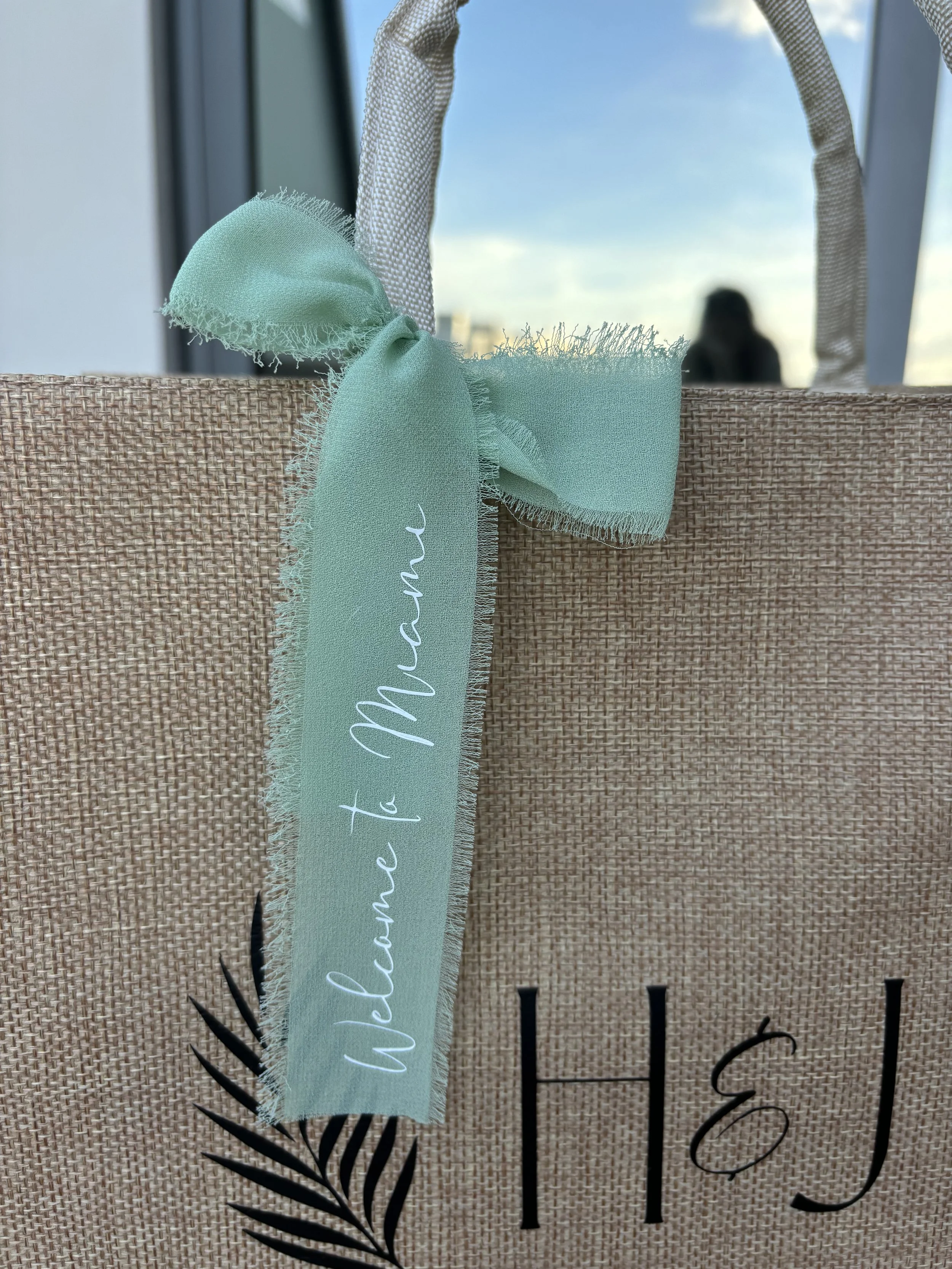 Guests were welcomed with personalized jute bags featuring the couple’s initials framed by delicate botanical accents. Finished with soft mint ribbons and a “Welcome to Miami” tag, the design embraced natural textures and understated elegance, setting a warm and refined tone for the wedding weekend.