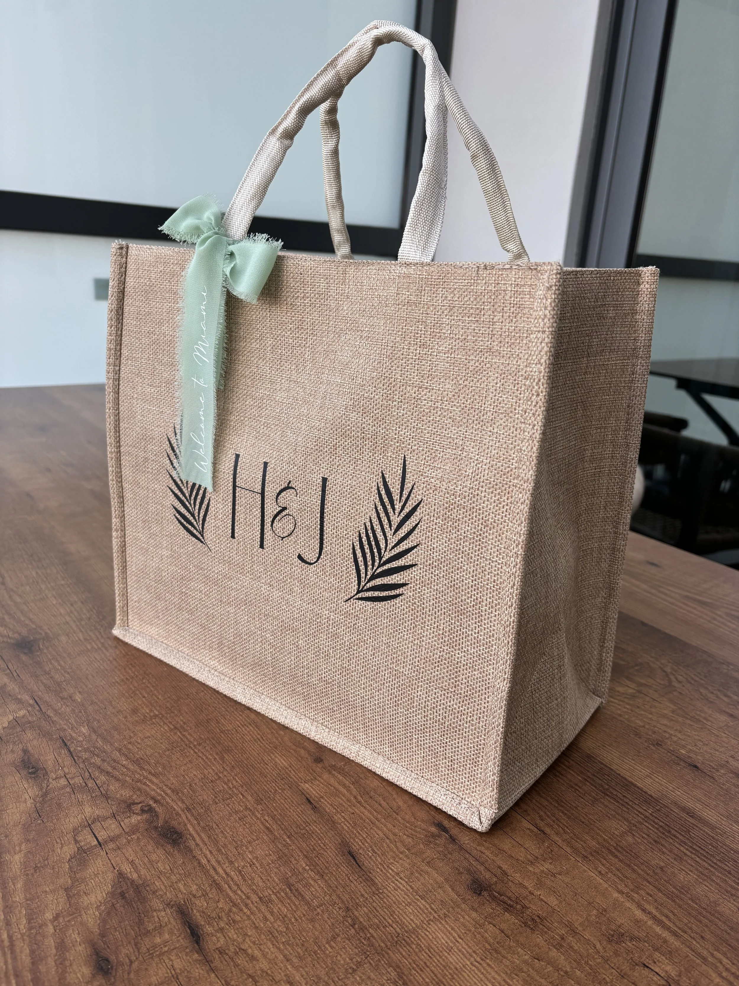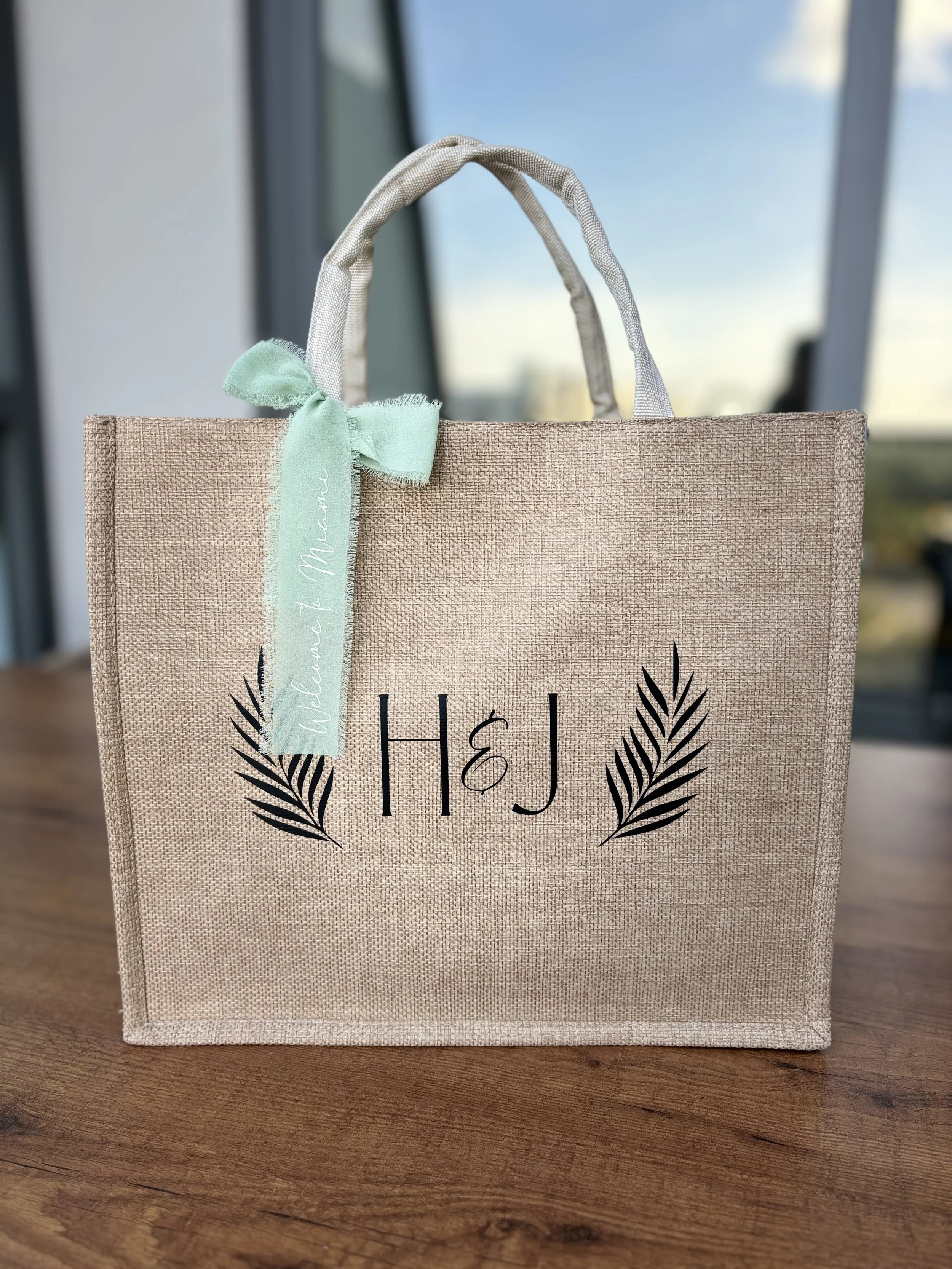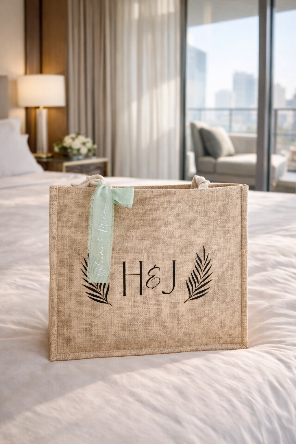 Guests were welcomed with personalized jute bags featuring the couple’s initials framed by delicate botanical accents. Finished with soft mint ribbons and a “Welcome to Miami” tag, the design embraced natural textures and understated elegance, setting a warm and refined tone for the wedding weekend.