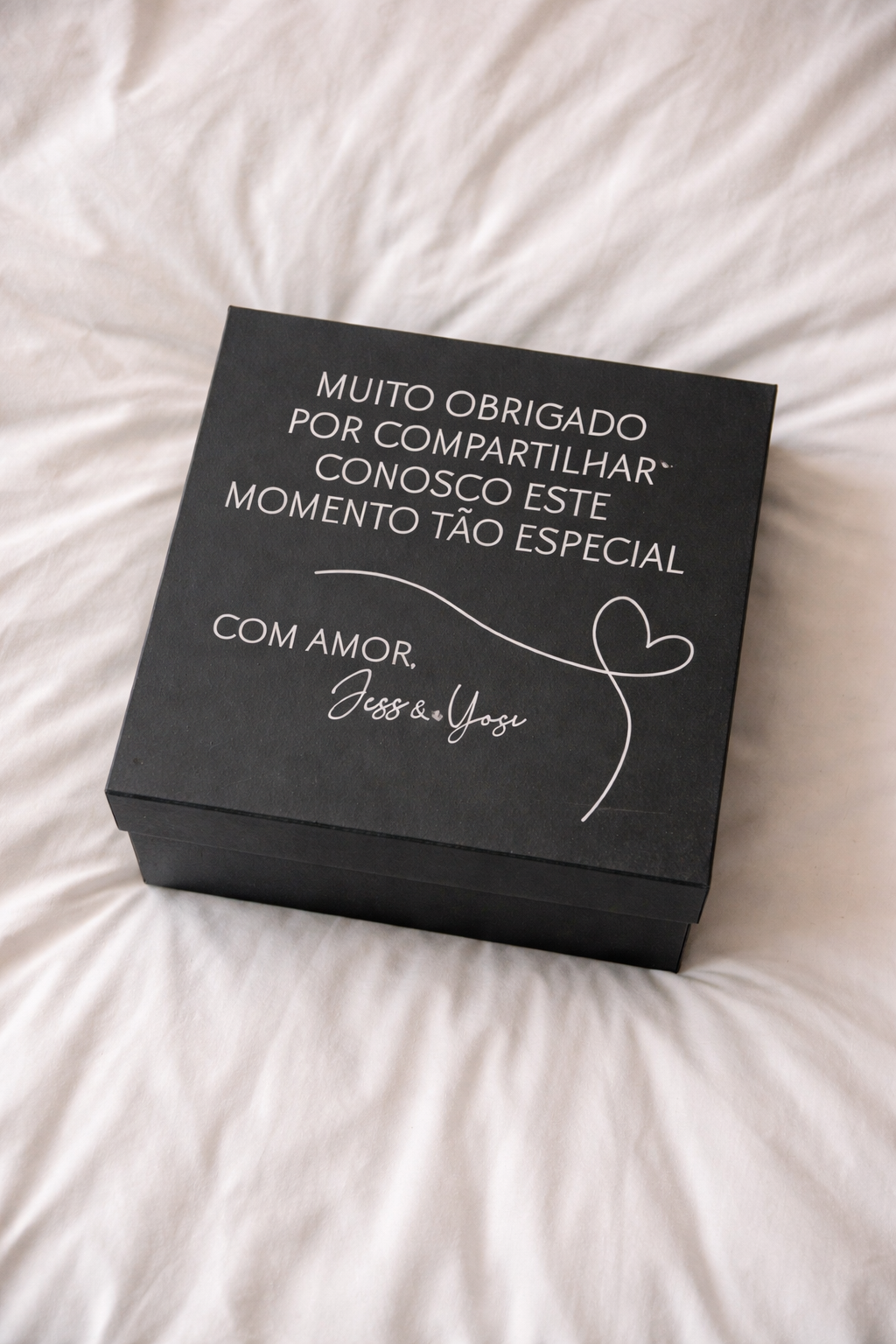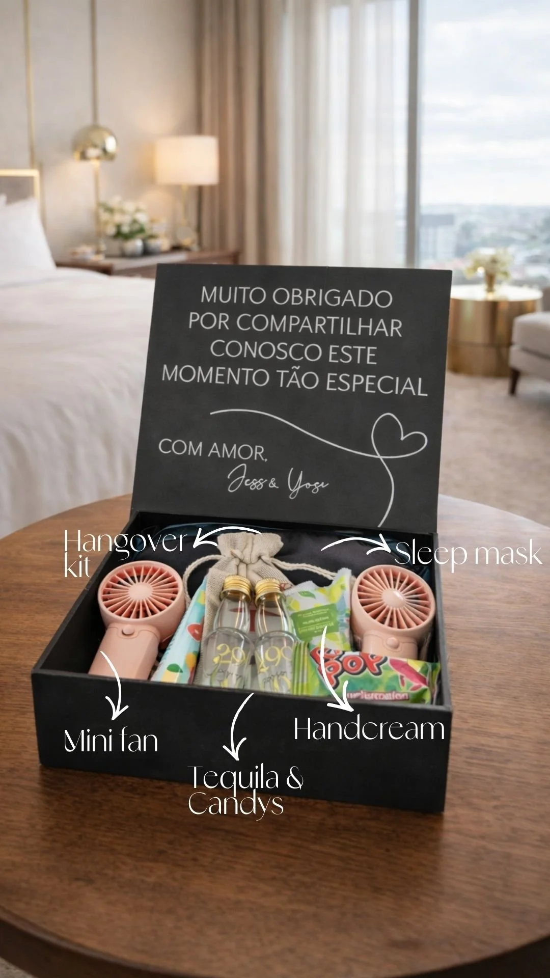 For J & Y’s wedding, guests were welcomed with curated hangover kits designed to add comfort and care to the celebration. Each box included mini fans, sleep masks, hand cream, tequila, and sweet treats, paired with a heartfelt note in Portuguese—creating a warm, thoughtful gesture that blended practicality with personal meaning for the wedding weekend.
